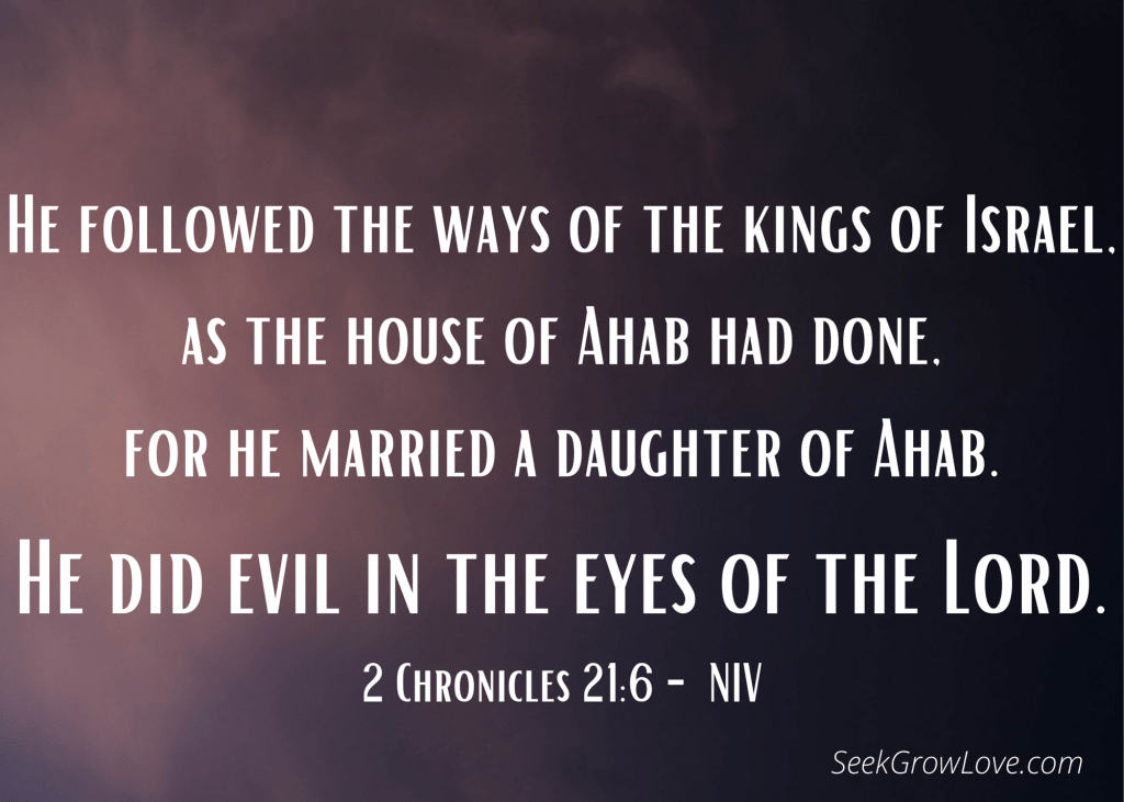 The main thing that jumps out at me from today’s reading is the importance of not only following the Lord ourselves wholeheartedly, but also how imperative it is to pass along a love for the Lord to our children (both physical and spiritual children). I’m convinced Jehoram could have been a great king, who loved the Lord, and had a blessed reign, if only Jehoshaphat had stressed the importance of following the Lord, and if Jehoshaphat had chosen a godly wife for Jehoram.