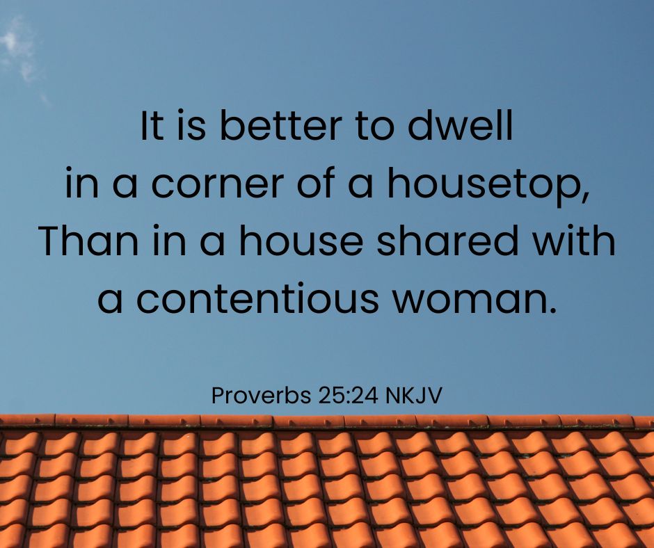 Proverbs 25:24 It is better to dwell in a corner of a housetop, Than in a house shared with a contentious woman. (Because sometimes saying it once isn’t enough.)
