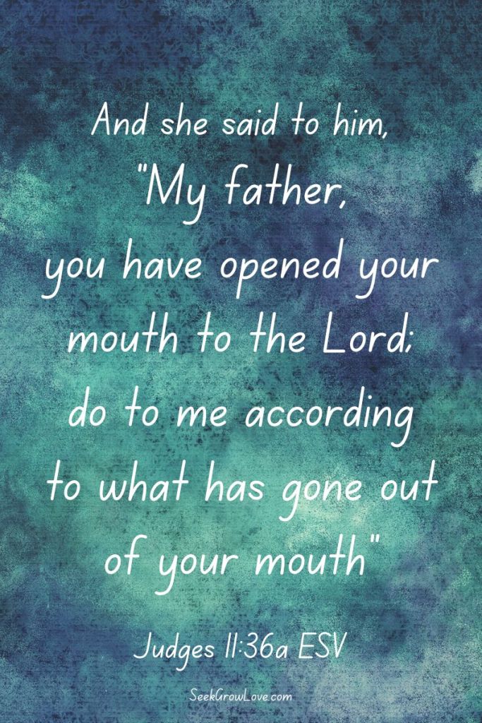 Today’s reading in Judges contains a very disturbing account in chapter 11 of Jephthah making a reckless vow before God that if He gives him victory against the Ammonites, he will sacrifice the first thing that comes out of the door of his home. Sadly the first thing out of his door ends up being his beloved daughter. His daughter supports him in honoring this vow to the Lord, but asks for him to first grant her time to roam the hills for two months and spend time with friends. After the two month period, Jephthah carries out this vow.