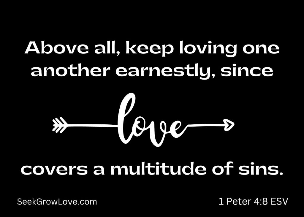 We’re instructed to love one another earnestly, because love covers a multitude of sins. (Greater love has no one than this, that someone lay down his life for his friends. John 15:13). “…in the face of extreme social hostility, love will be necessary for spiritual survival. For Peter the primacy of love is accompanied by a qualification, and this qualification is a partial citation of Proverbs 10:12 similar to James 5:20—’love covers over a multitude of sins,’ rather than magnifying the faults of others. After all, love is patient and doesn’t keep a record of wrongs (1 Corinthians 13:4, 5)” (J. Daryl Charles, “1 Peter,” in Hebrews–Revelation, vol. 13 of The Expositor’s Bible Commentary Revised Edition).