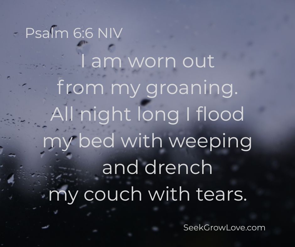 Psalm 6 is the first of what are considered the “psalms of penitence”, and we see David starting this psalm with reference to rebuke and discipline indicating he knew that some of his pain and sufferings were connected to sin. Guilt is a powerful emotion and many of our other emotional challenges can build upon it when we haven’t released it to God. David is a stellar example in so many ways, and I am grateful that one of those ways is demonstrating what to do after making mistakes. Big mistakes. I love that we know more of David’s thoughts and not just his historical story. The psalms are very relatable because of their expression of emotion, and there are reasons that words from them are swarming in worship songs, requested at funerals, hospital rooms, and times of emotional need.